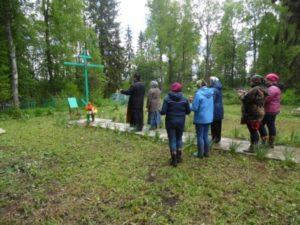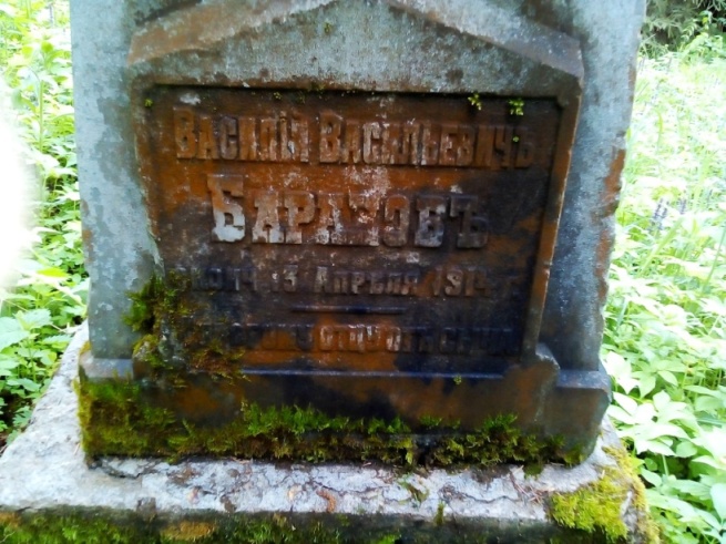 Рядом с Крестом находится кладбище. Женщины показали старейшую могилу Василия Васильевича Баранова, похороненного в 1914 году. В нише надгробия свито гнездо, малые пичуги таким образом показывают, что жизнь продолжается…